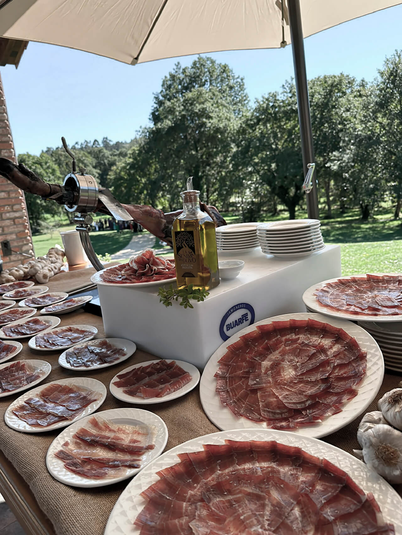 El rincón que siempre triunfa es el del profesional cortando, al momento y en finísimas lascas, el mejor jamón ibérico. En nuestro puesto siempre te ofrecemos uno de los mejores: Sánchez Romero Carvajal, para que combines con diferentes panes y aceites disponibles. Nuevamente, para asegurar la mayor calidad, frescura y corte del producto, solo admitimos nuestros jamones y cortadores.