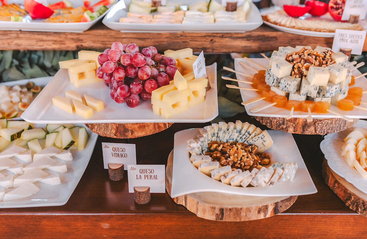 Una impresionante estación que incluye de 15 a 20 variedades de quesos de Asturias ya cortados y presentados según su clase. Los acompañamos con dulces, frutas y panes diferentes, para que elijas tu combinación favorita. Además, te garantizamos calidad, frescura y seguridad: no subcontratamos el servicio y cada tipo de queso incluye identificación e información detallada (según tipo de leche, ingredientes y si es apto o no para embarazadas).